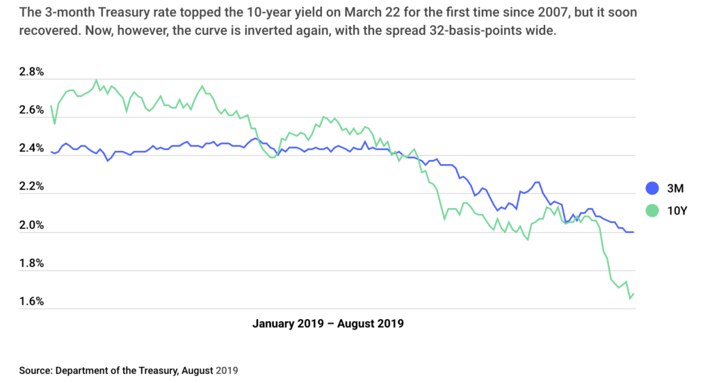 As pithily put by CNBS, “Amid falling interest rates in the broader U.S. bond market, the yield on the benchmark 10-year Treasury note has fallen below the two-year yield several times since Aug. 14. In a healthy market, long-term bonds carry a higher interest rate than short-term bonds. When short-term bonds deliver a higher yield, it’s called an inversion of the yield curve. The bond market phenomenon is historically a trusty signal of an eventual recession: It has preceded the seven last recessions.”