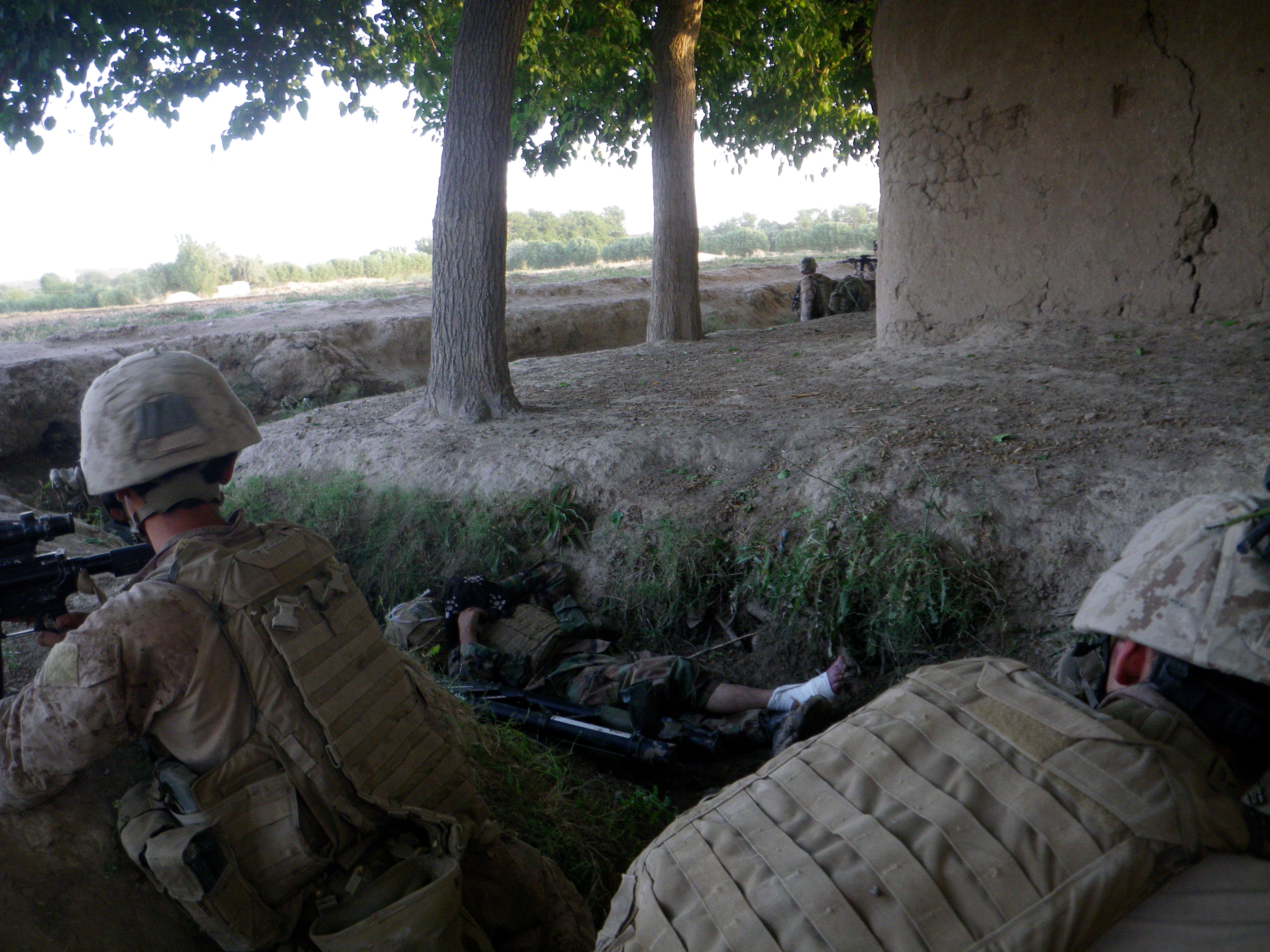 Photo of 1st Platoon from their fighting position in the canal (note the treated casualty).