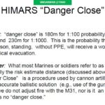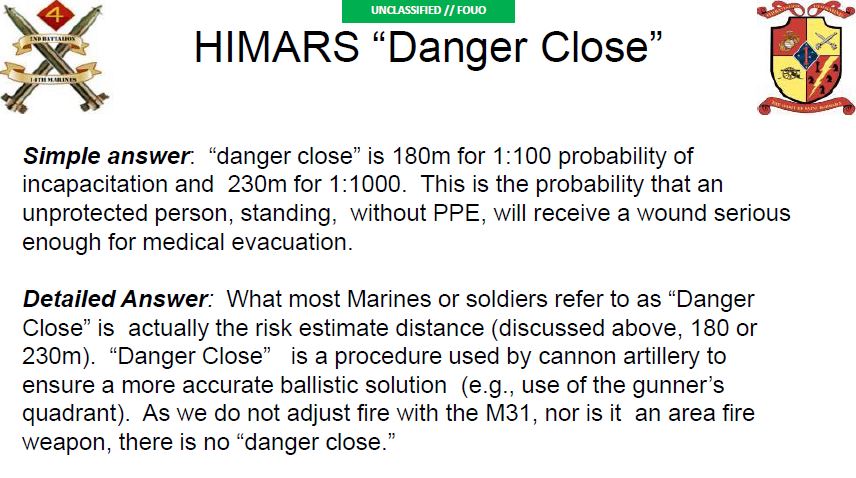 In spite of the “danger close” range for friendly forces, two 675-lbs HIMAR warheads were fired at the enemy position — only 70 meters from the men of 1st Platoon — this time killing the enemy inside as later confirmed during a BDA. That particular munition has a probability of incapacitation of 180 meters (Pi: 1:100) and Pi of 1:1000 of 230 meters, which is significantly greater than the Hellfire or Griffin missiles that Maj. Galvin again recommended.