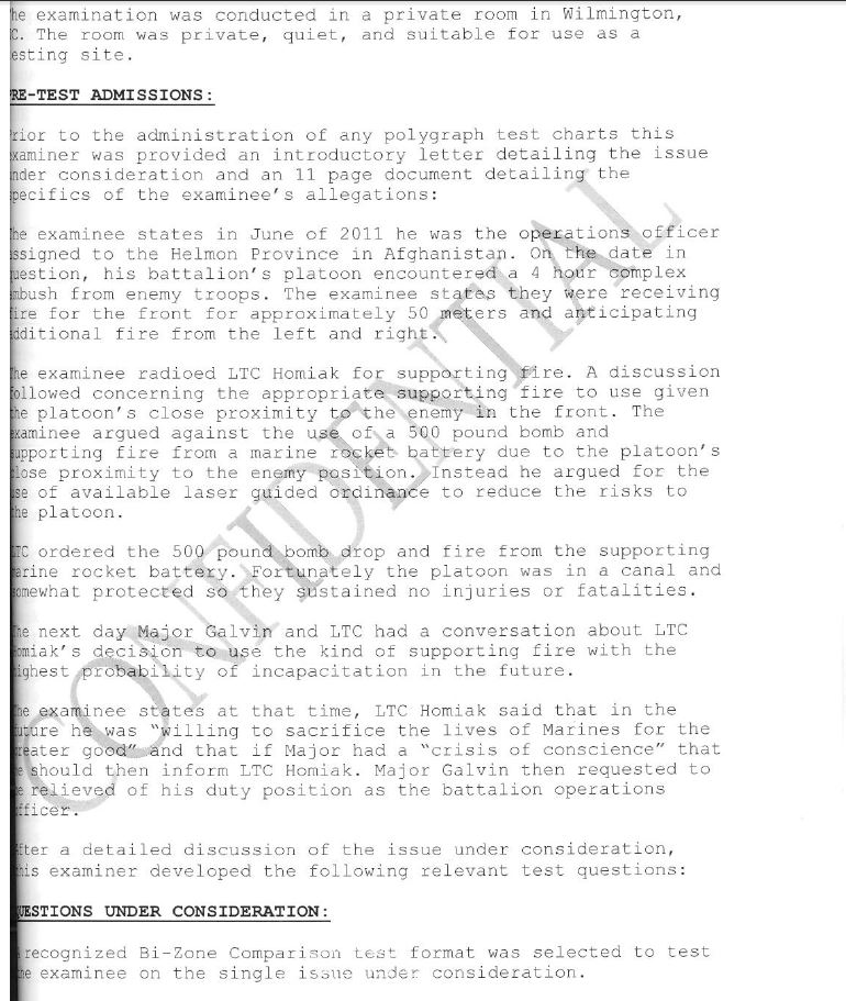 Galvin expressed to Homiak that in situations such as the attack on Bravo Company, where no civilians were in the area, and the enemy was clearly defined, it was warranted to use precision-guided weapons with low yield, especially within the restraints of the Coalition’s Counter-Insurgency Operations (COIN) Strategy. Homiak disagreed and again stated his preference to restrict the further use of fires, in spite of the fact that Marines and Sailors might be killed as a result. In fact, Homiak reiterated his sentiment to Galvin a second time that he was “willing to sacrifice the lives of the Marines, for the greater good.” Galvin later took a polygraph test examined by T. V. O’Malley, who was the President of the American Polygraph Association, which confirmed that this statement was true.