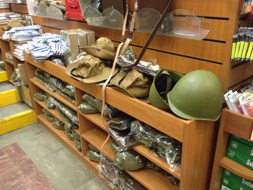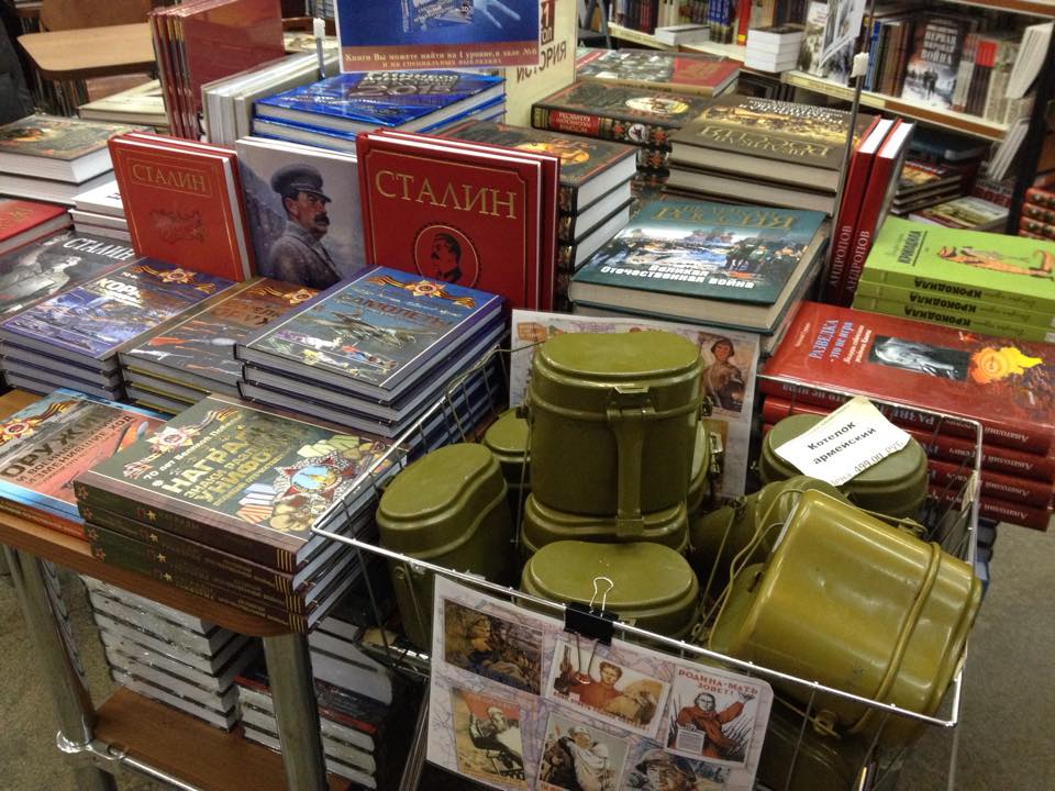 The idea to create authoritarian and militarist mood through bookstores was brilliant. In 2015, I visited Moscow’s central bookstore “Biblio-Globus”, and that what were the goods welcoming you just after the doors: military uniforms, accessories, and books about Stalin and war.