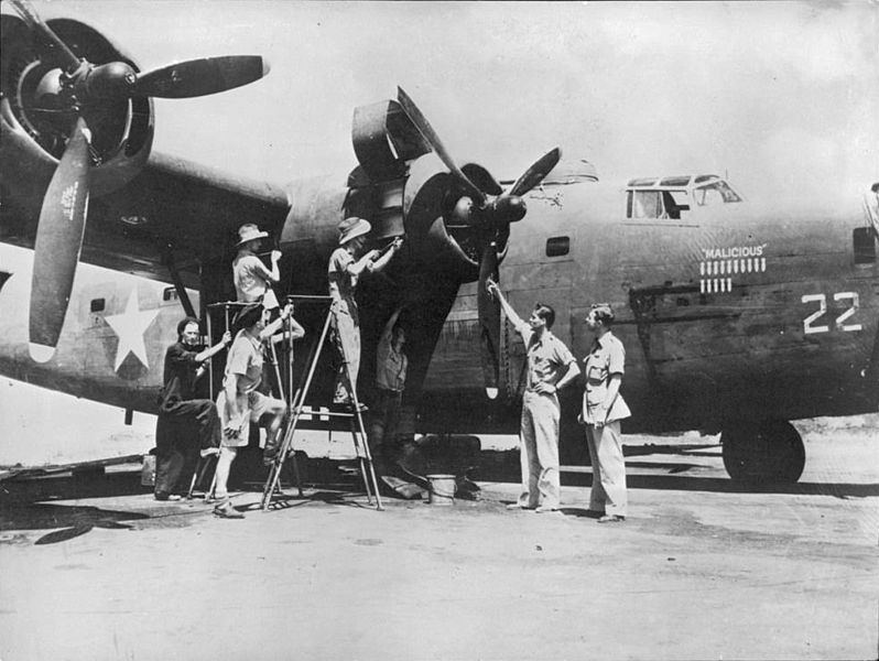 Strong contingent of U.S. troops reinforces the British in the Middle East. Australian and American mechanics are seen working on an American B-24 bomber (the Malicious) after its return from a bombing mission. (Unknown photographer, Public domain, via Wikimedia Commons)