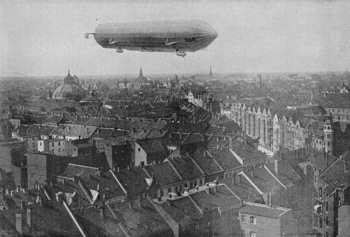 The Zeppelin airship “Deutschland LZ 8” over the city of Düsseldorf in April 1911. (Peter Lölgen Architekturfotograf, Public domain, via Wikimedia Commons)