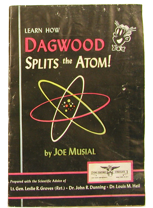 The toy set came with four different types of Uranium ore: a beta-alpha source (Pb-210), a pure beta source (Ru-106), and a gamma source (Zn-65). There was also a spinthariscope, a cloud chamber with its own short-lived alpha source (Po-210), an electroscope, a Geiger counter, a manual, the Dagwood Splits the Atom comic book, and a government manual “Prospecting for Uranium.”