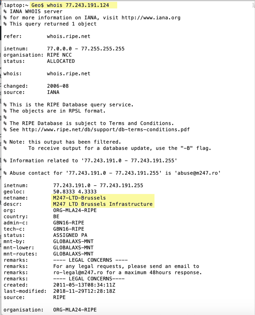 Please let me demonstrate by reading my IP address and (no kidding) giving it to you right now: 77.243.191.124 is my IP. I now open a terminal window on my computer and type “whois 77.234.191.124″ at the command prompt and hit enter. That command queries “the Internet” and learns that 77.243.191.124 is an IP address out of Brussels, Belgium — no foolin’!