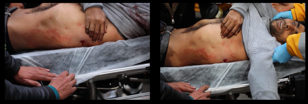 Using video footage, the investigative team argues that a man was allegedly wounded at about 1027 (Eastern European Time). Then, at approximately 1030, a second person, Gulzar, was also wounded. The investigative team presents pictures from Gulzar’s evacuation to buttress its claims.