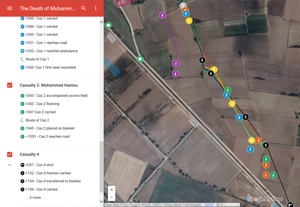 - The first allegedly wounded person was evacuated at 1027, and, as the investigation points out, he suffered face “injuries,” emphasis on the plural. In the footage, however, his face is covered, so it is not possible to estimate what kind of “injuries” he sustained. If he had indeed been shot by a 5.56mm cartridge, which is fired from a rifled barrel, the projectile would not have caused numerous points of entry. Indeed, the report’s description aligns more with a shotgun shot that fires numerous small projectiles. Shotguns, however, have an effective range of a few tens of meters. Yet, the spot that the investigators recorded this man at being wounded is about 500 meters away from the border fence and completely outside the effective range of a shotgun.