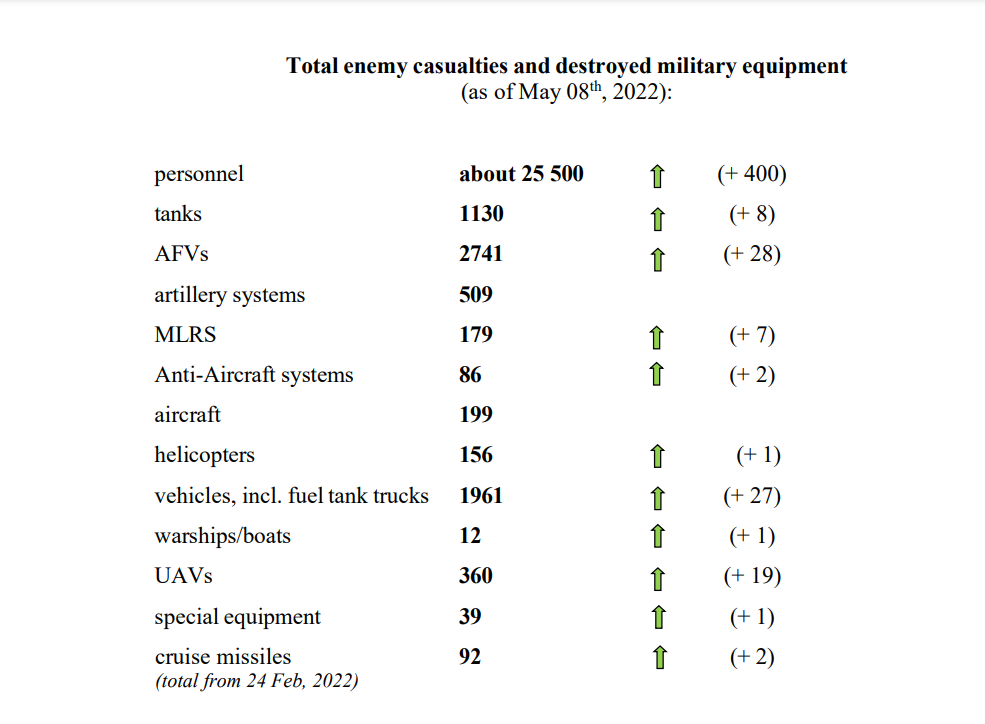 The numbers below are Ukrainian army estimates of the total losses by Russia so far in the war. In terms of ground forces alone, these losses represent the utter destruction of two entire Armored Divisions and an air force Wing of aircraft and helicopters each.