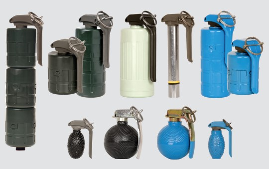 Nammo’s series of grenades, with the stacked Mark 21 grenades shown on the left. (Nammo)