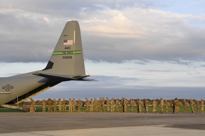 Soldiers from the 541st Sapper Company board an Air Force C-130J Super Hercules from Little Rock Air Force Base, Arkansas Oct. 30, 2018, at Ft. Knox, Kentucky. As directed by the Department of Defense through Army headquarters, the 541st Sapper Company are deploying soldiers, equipment, and resources to assist Department of Homeland Security along the southwest border. (U.S. Air Force photo by Airman First Class Daniel A. Hernandez)