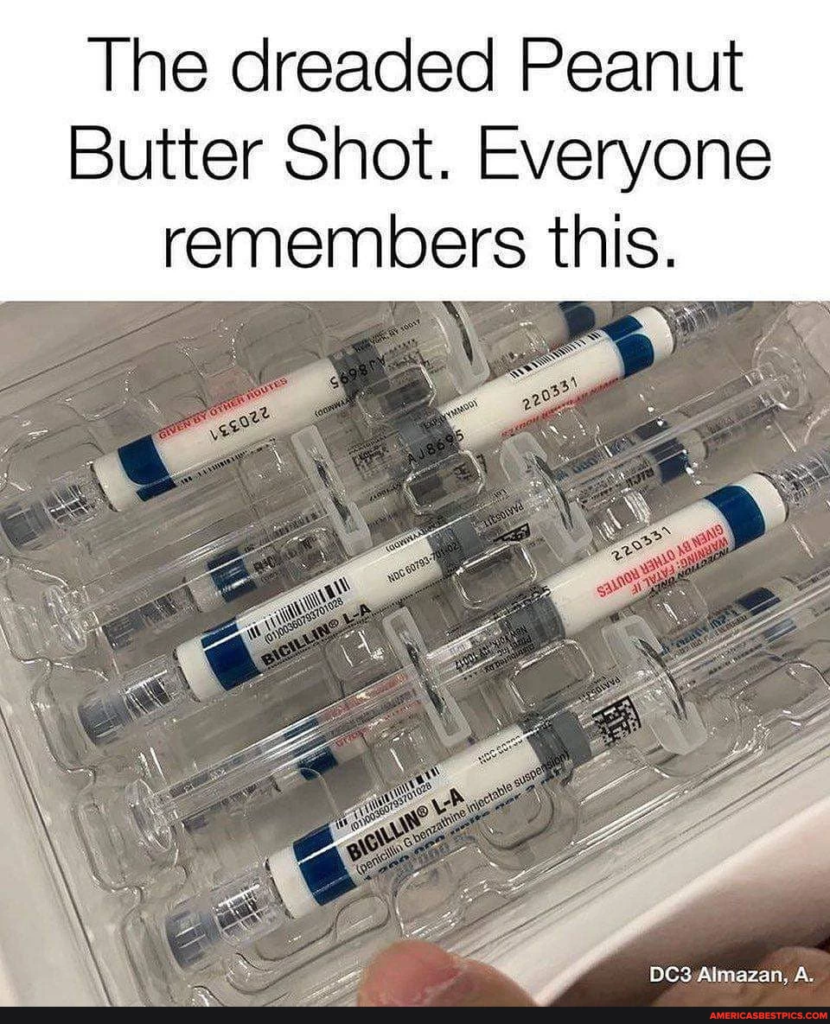 The Peanut Butter Shot was a form of pre-vaccination in the military. Boot camps had a history of group A Streptococcus outbreaks, otherwise known as Strep-Throat and it can be deadly. Today, the Peanut butter shot has become the stuff of legends. There are rumors that the shot is no longer administered to enlistees, but they are just rumors. There are many antibiotics on the market now in pill form that do not require painful intramuscular injections and they do offer alternatives to those with documented(they won’t take your word for it) allergies to penicillin but as of 2019, you would still have to Drop-Trow, assume the position and take a needle the size of the blow-guns they use in Borneo.