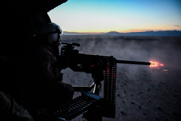 Naval Aircrewman (Helicopter) 3rd Class Copper McCambridge, from Murrieta, Calif., assigned to the “Black Knights” of Helicopter Sea Combat Squadron (HSC) 4, fires a M3 .50-caliber machine gun during an initial aerial gunnery training qualification at Naval Air Facility El Centro, Calif. HSC-4 provides vertical lift search and rescue, logistics, anti-surface warfare, special operations forces support, and combat search and rescue capabilities. HSC 4 provides vertical lift search and rescue, logistics, anti-surface warfare, special operations forces support, and combat search and rescue capabilities. (U.S. Navy photo by Chief Mass Communication Specialist Shannon Renfroe/Released)