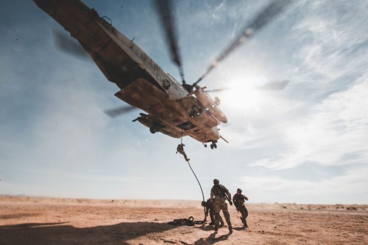 U.S. Army Special Operation Soldiers with 3rd Battalion, 7th Special Forces Group (Airborne) conduct Fast Rope Insertion/Extraction System (FRIES) from a U.S. Marine Corps CH-53E Super Stallion during Integrated Training Exercise 3-19 at Marine Corps Air-Ground Combat Center Twentynine Palms, Calif., April 27, 2019. FRIES training focused on Green Berets ability to rapidly insert on an objective.