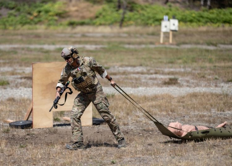 A U.S. Air Force Tactical Air Control Party (TACP) specialist pulls a dummy during the 2019 Lightning Challenge July 30, 2019 at Joint Base Lewis-McChord (JBLM), Wash. The Lightning Challenge aims to enhance TACP mission readiness, provide feedback concerning unit training effectiveness, and promote warrior spirit through friendly competition. The Lightning Challenge consisted of 20 two-man TACP teams competing to be recognized as best in the career field.