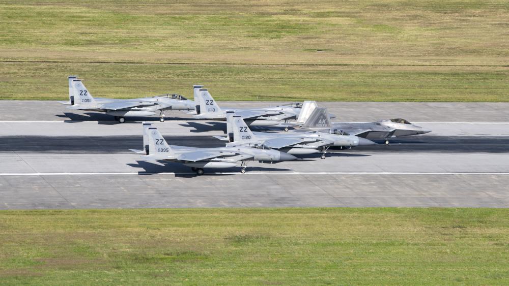 U.S. Air Force aircraft line up on the runway during a capabilities demonstration at Kadena Air Base, Japan