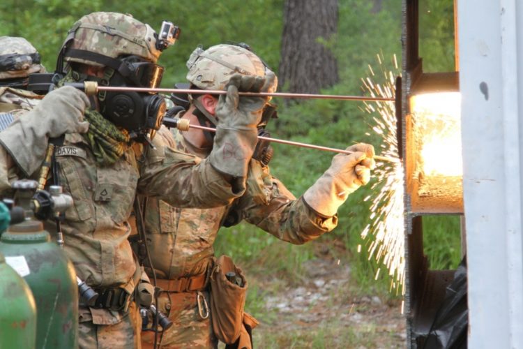 Paratroopers assigned to 37th Brigade Engineer Battalion, 2nd Brigade Combat Team, 82nd Airborne Division, conduct simulated subterranean breaching techniques and chemical reconnaissance testing for chemical agents as part of the battalion’s week-long field training exercise. The engineer battalion also trained using the self-containerized breathing apparatus or SCBA. (Photo by Staff Sgt. Anthony Johnson)