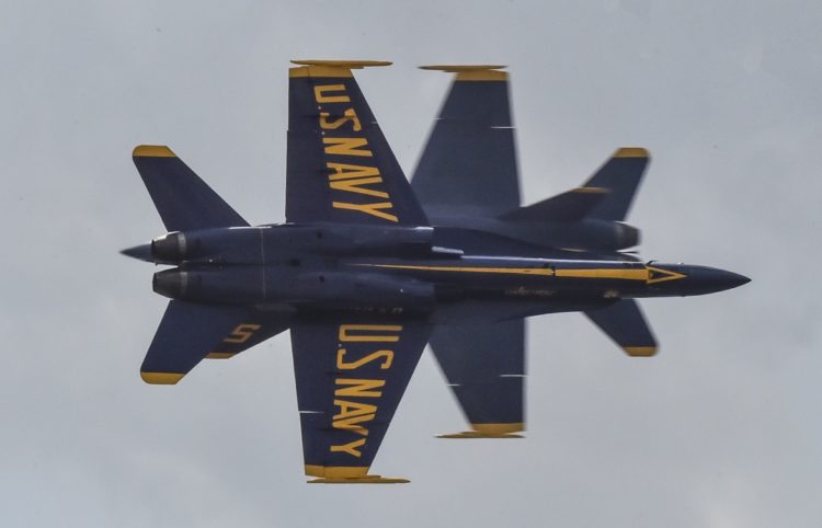 Solo pilots assigned to the U.S. Navy Flight Demonstration Squadron, the Blue Angels, perform the Opposing Minimum Radius Turn maneuver during an exhibition at the Quad City Air Show at the Davenport Municipal Airport in Davenport, Iowa, on June 29, 2019. The team is scheduled to conduct 61 flight demonstrations at 32 locations across the country to showcase the pride and professionalism of the U.S. Navy and Marine Corps to the American and Canadian public in 2019.