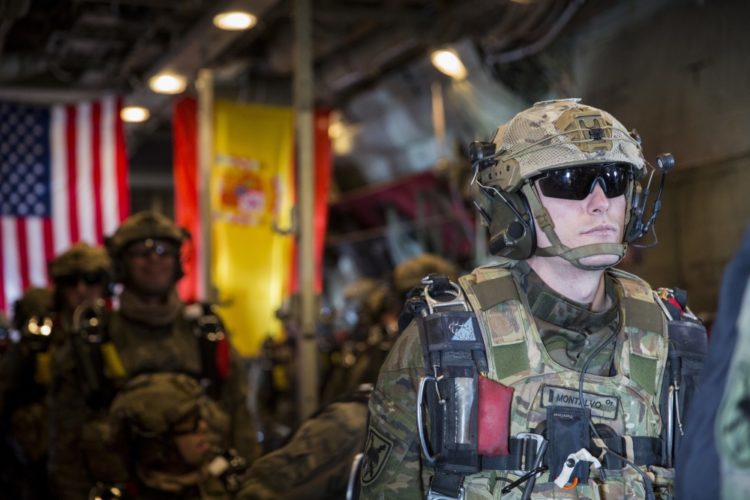 A Spanish soldier lines up to perform a military free-fall jump from a U.S. Marine Corps KC-130T during Death From Above in Torrejon, Spain, Nov. 30, 2018. Death From Above is a bilateral exercise that allows U.S. Marines with Special Purpose Marine Air-Ground Task Force-Crisis Response-Africa and Spanish soldiers to practice high-altitude jumps and air-delivery drops. SPMAGTF-CR-AF is a rotational force deployed to conduct crisis-response and theater-security operations in Europe and Africa.