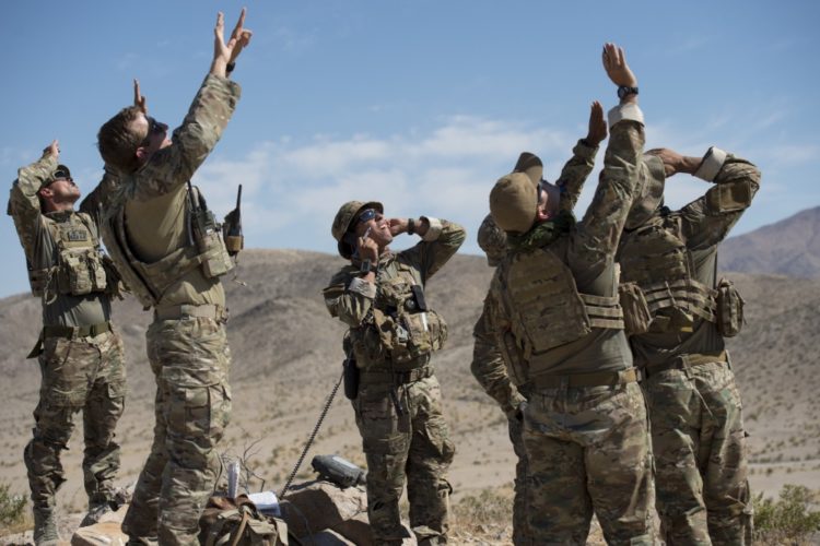 A tactical air control party specialist assigned to the 12th Combat Training Squadron works with the Brazilian Air Force TACPs and the 124th Air Support Operations Squadron, Idaho Air National Guard, at the National Training Center, Fort Irwin, California, June 12, 2019. The Brazilian Air Force was training with the 124 ASOS TACPs and the 12th CTS TACPS during NTC.
