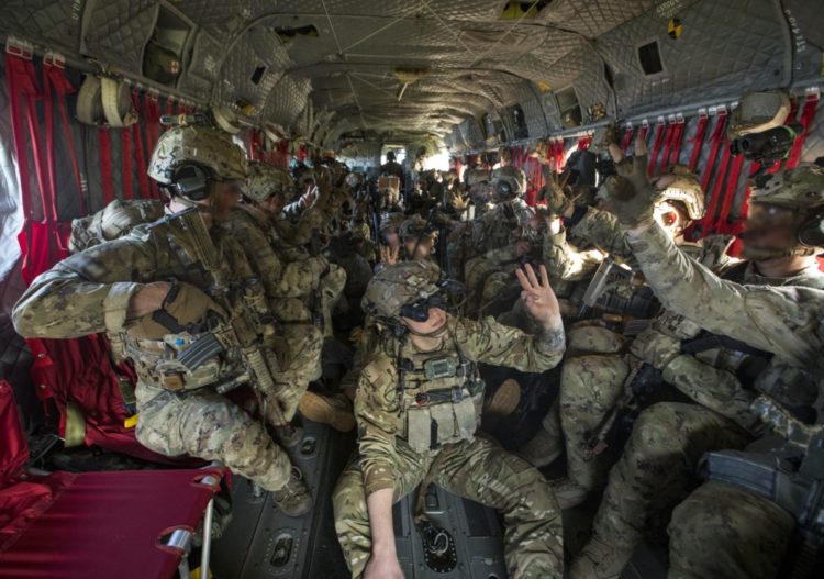 Aboard a U.S. Army CH-47 helicopter from the 12th Combat Aviation Brigade, U.S. Army Rangers assigned to the 75th Ranger Regiment and Italian Army Rangers with the 4th Alpini Regiment signal three minutes to landing on their way to conduct a raid at the Joint Multinational Readiness Center in Hohenfels, Germany, on April 25, 2018. The Joint War-fighter Assessment helps the Army evaluate emerging concepts, integrate new technologies, and promote interoperability of the U.S. and partner nations. (U.S. Army photo by 1st Lt. Benjamin Haulenbeek)
