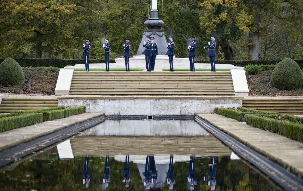 Honor guard members from RAF Mildenhall conduct the firing of volleys at Cambridge American Cemetery and Memorial in Cambridge, England, Nov. 11, 2022. 3,811 U.S. servicemen, women and civilians rest at the cemetery, having paid the ultimate price in defense of freedom. (U.S. Air Force photo by Senior Airman Jason W. Cochran)