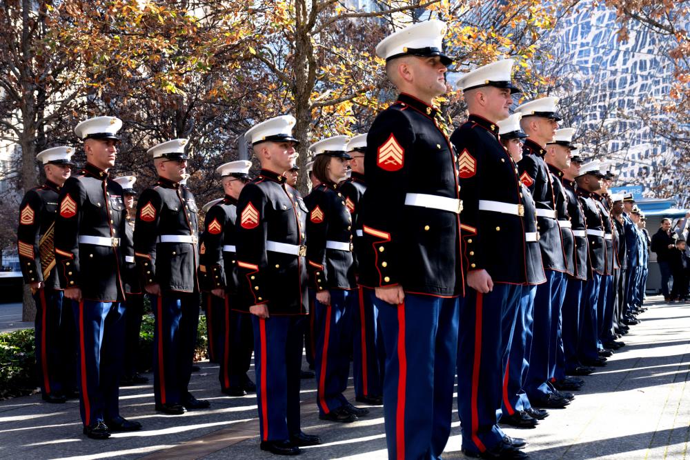 U.S. Marines stand in formation for a multi-branch re-enlistment ceremony at the 9/11 Memorial reflection pools in New York, Nov. 10, 2022. U.S. Secretary of the Navy Carlos Del Toro administered the re-enlistment ceremony in observance of Veterans Day, for military personnel from the U.S. Marine Corps, U.S. Coast Guard and U.S. Navy, who reaffirmed their commitment to defending the nation. (U.S. Marine Corps photo by Sgt. Heather Atherton)