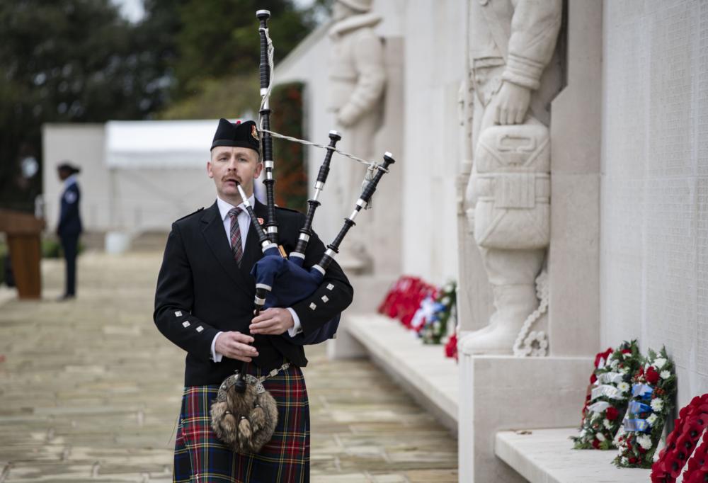 Iain Hildreth, 423d Civil Engineer Squadron lead firefighter, plays the lament “Flowers of the Forest” at Cambridge American Cemetery and Memorial in Cambridge, England, Nov. 11, 2022. 3,811 U.S. servicemen, women and civilians rest at the cemetery, having paid the ultimate price in defense of freedom. (U.S. Air Force photo by Senior Airman Jason W. Cochran)