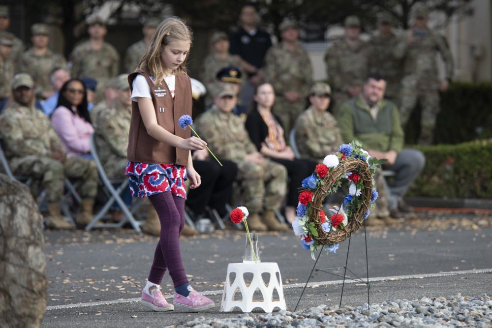 Felicity Norton, Girl Scout Brownie troop, participates in the “Three Flower Ceremony” during the 2022 Yokota Veterans Day Ceremony at Yokota Air Base, Japan, Nov. 10, 2022. The “Three Flower Ceremony” is meant to offer solemn tribute to all members wherever they may rest. The ceremony served as a time to reflect on those who served generations past and commemorate their selfless and courageous actions in service to their country. (U.S. Air Force photo by Tech. Sgt. Christopher Hubenthal)