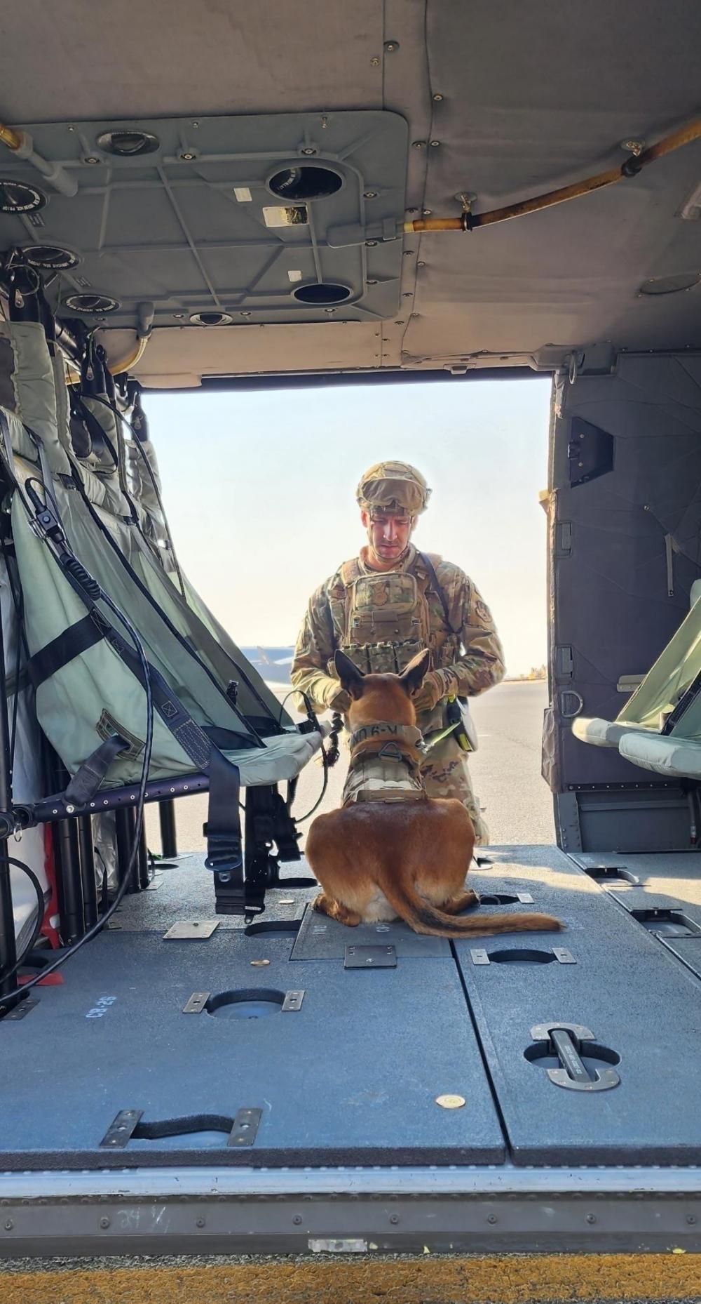 U.S. Air Force Staff Sgt. Craven, a handler for the Military Working Dog Section of 386th Expeditionary Security Forces Squadron, prepares working dog Tank for familiarization training on a U.S. Army UH-60M Black Hawk helicopter provided by 3rd Battalion, 142nd Aviation Regiment, Assault Helicopter