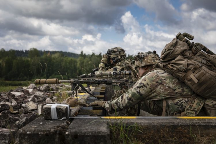 July 21, 2019 – U.S. Army Spc. Kristofer Encinas, a sniper, and Alex Stoyonovich, a sniper team spotter, with 1st Squadron, 91st Cavalry Regiment, engage a target prior to clearing a building during the European Best Sniper Team Competition at the Grafenwoehr Training Area in Germany. The European Best Sniper Team Competition is a U.S. Army Europe-directed/7th Army Training Command (7ATC)-hosted contest of skill that includes 17 participating NATO allies and partner nations from July 20 to the 26th. The European Best Sniper Team Competition is designed to improve professionalism and enhance esprit de corps.