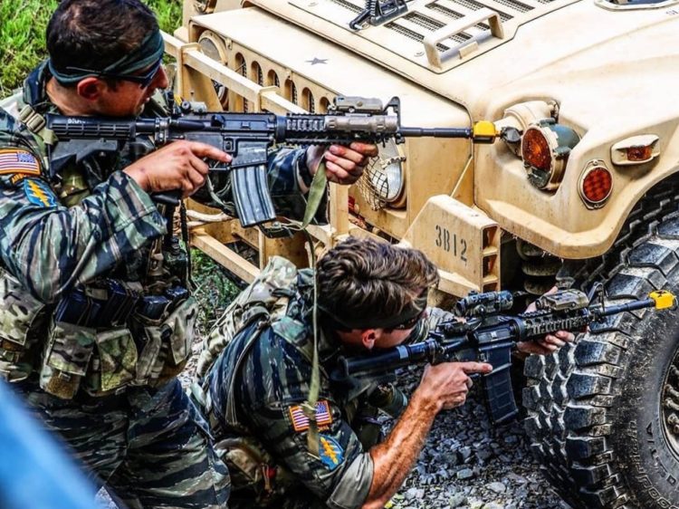 Special Forces operators from the 5th Special Forces Group (Airborne) conduct joint exercise with Soldiers from 1st, Squadron, 75th Cavalry Regiment, 2nd Brigade Combat Team, 101st Airborne Division at Fort Campbell, KY. The Green Berets are seen wearing the Tiger Stripes camouflage pattern uniform. The Tiger Stripes was worn and popularized by Long Range Reconnaissance Patrols (LRRP) and Special Operations Forces (SOF) during the Vietnam War. More recently, a desert variant of the Tiger Stripes has been worn by SOF and paramilitary units in Afghanistan.
