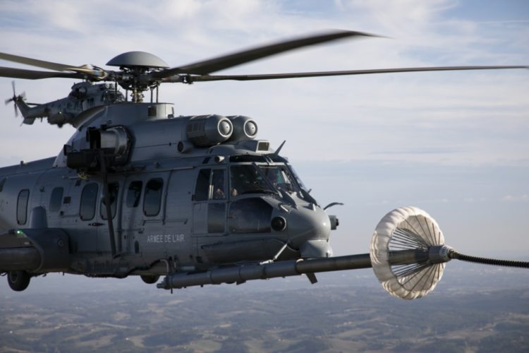 A French Eurocopter EC725 connects to the fuel hose of a U.S. Air Force MC-130J Commando II, assigned to the 352nd Special Operations Wing, based out of RAF Mildenhall, during a helicopter air- to- air refueling (HAAR) exercise Oct. 17, 2019, outside of Cazaux Air Base, France. This mission was part of a larger exercise called Operation Dark Dune, which involves aircraft and crewmembers from the 352nd SOW’s 67th Special Operations Squadron. These exercises allow U.S. special operations forces the opportunity to train with ready and capable French military units, while increasing interoperability and familiarization within NATO SOF.