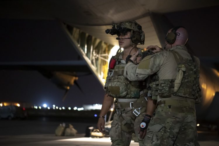 U.S. Air Force pararescuemen with the 82nd Expeditionary Rescue Squadron, deployed in support of Combined Joint Task Force – Horn of Africa (CJTF-HOA), check their parachute rigs before they participate in joint personnel recovery training, Camp Lemonnier, Djibouti, on December 6, 2018.