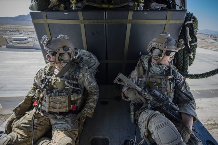 Two pararescuemen, both assigned to the 58th Rescue Squadron, ride to their destination in the back of an HH-60 Pave Hawk during the Joint Civilian Orientation Conference (JCOC) 91 at Nellis Air Force Base, Nev., June 26, 2019. Pararescuemen are highly trained Airmen able to rappel out of aircraft to rescue injured individuals on the battlefield.