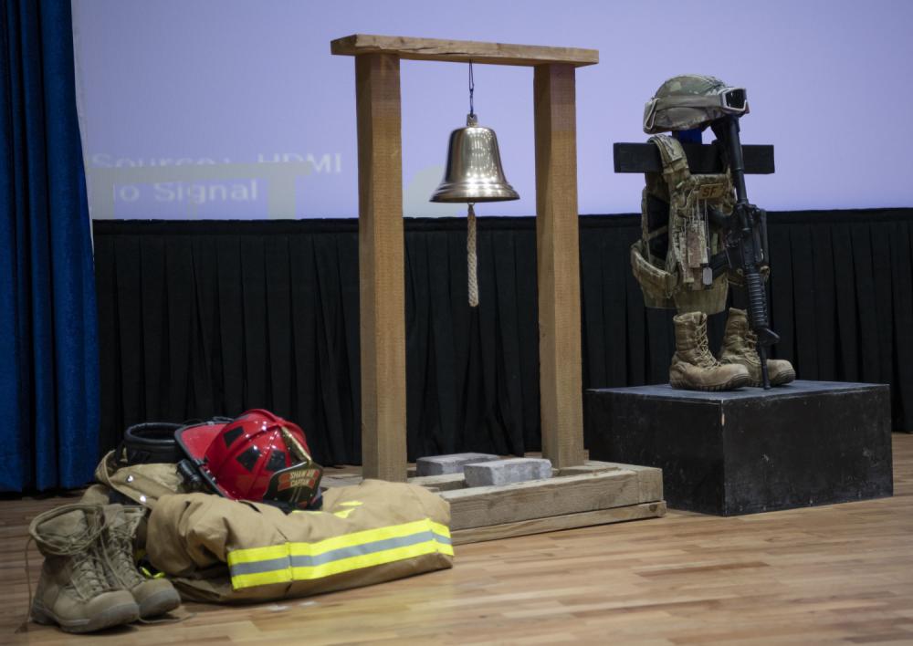 A memorial display is arranged at a Patriot Day ceremony at Ali Al Salem Air Base, Kuwait, September 11, 2022. The display is meant to honor those who were lost heroically trying to save lives that day. (U.S. Air Force photo by Staff Sgt. Ashley N. Mikaio)