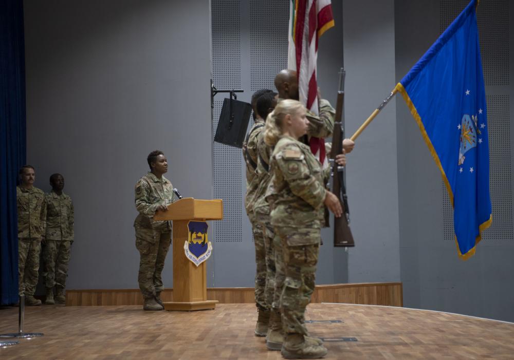 U.S. Air Force Senior Master Sgt. Ashley Montgomery, 386th Expeditionary Force Support Squadron Personnel Support for Contingency Operations team chief, sings the national anthem at the Patriot Day memorial ceremony at Ali Al Salem Air Base, Kuwait, September 11, 2022. Airmen and coalition partners gathered for the ceremony to honor and remember the lives lost 21 years ago in the United States. (U.S. Air Force photo by Staff Sgt. Ashley N. Mikaio)