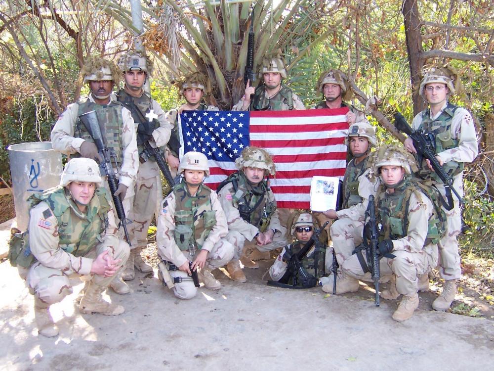 Soldiers with the 4th Infantry Division hold the Ground Zero Flag over the spider hole where they found Saddam Hussein, Dec. 13, 2003, near Tikrit, Iraq. The unit displayed the flag proudly as a reminder of the promise the Nation made after 9/11 to “Never Forget”. (Courtesy photo from the Ground Zero Flag Team)