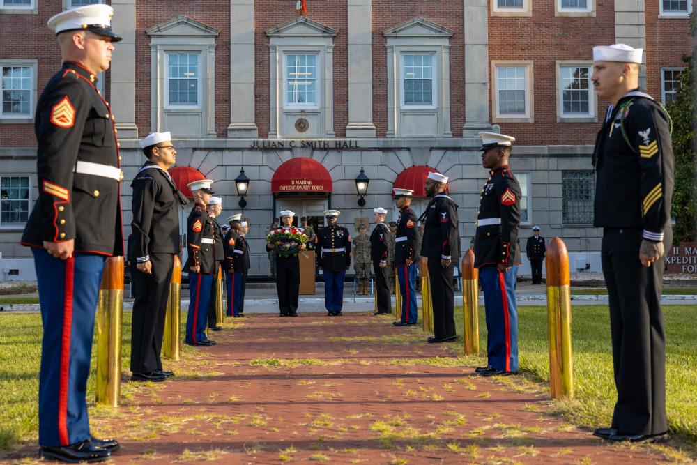 U.S. Marines and Sailors from 2d Marine Division participate in a wreath-laying ceremony on Camp Lejeune, North Carolina, Sept. 9, 2022. This ceremony is a tribute to those who made the ultimate sacrifice and in remembrance of the events on Sept. 11, 2001. (U.S. Marine Corps photo by Lance Cpl. Deja Thomas)