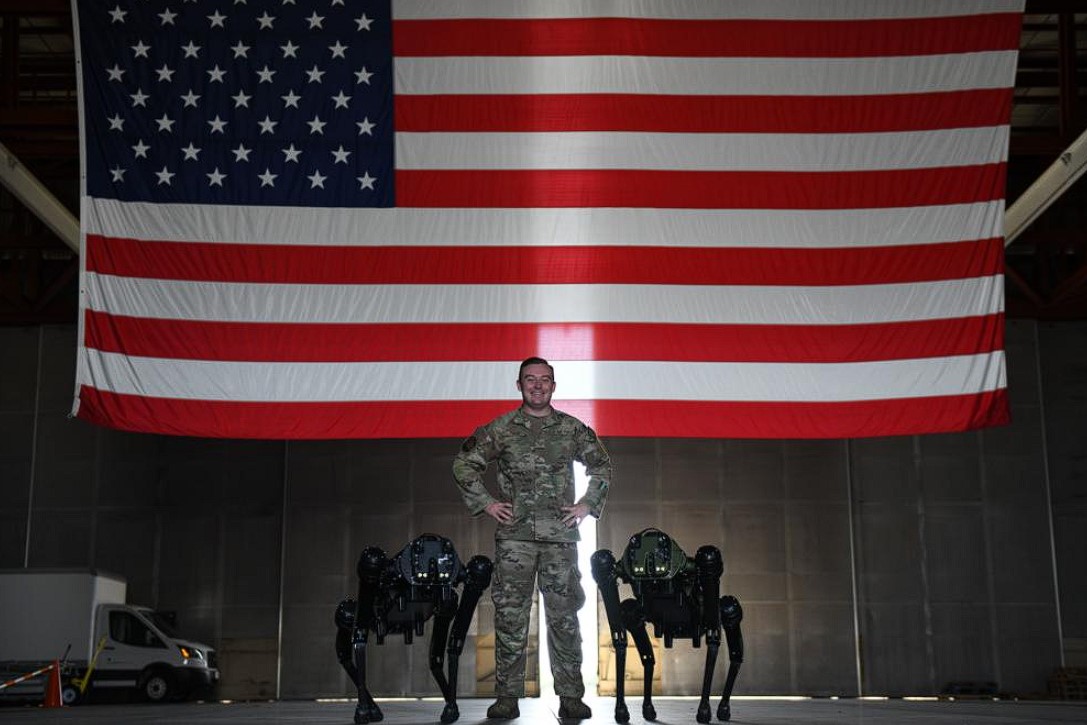 U.S. Air Force Tech Sgt. Brandon Priddy, 45th Security Forces Squadron non-commissioned officer in charge of innovation and technology poses for a picture with Ghost Robotics Vision 60 Quadruped Unmanned Ground Vehicles (Q-UGV) at Cape Canaveral Space Force Station, Fla., July 28, 2022. The Q-UGV will be used for damage assessments and patrol to save significant man hours. (U.S. Space Force photo by Senior Airman Samuel Becker)