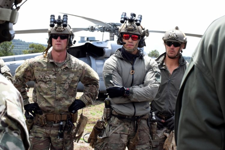 Staff Sgt. Andrew, Sgt. 1st Class Jay, and Sgt. 1st Class Jeff, all soldiers assigned to 7th Special Forces Group, participate in mission planning with members of Helicopter Sea Combat Squadron Six prior to rigorous fast-rope rehearsals designed to help both teams successfully infiltrate enemy terrain during Red Flag Rescue. Red Flag Rescue is the world’s premier air combat exercise and provides an opportunity for teams from all components and branches of the U.S. military, as well as foreign allies, to train together and fine-tune procedures that will be used in combat.