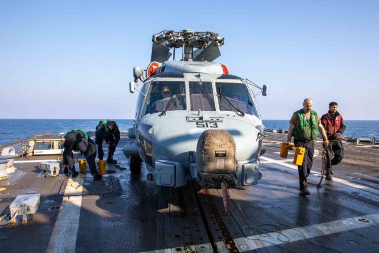 Sailors assigned to the Arleigh Burke-class guided-missile destroyer USS Nitze (DDG 94) remove chock and chains from an MH-60R Seahawk helicopter, attached to Helicopter Maritime Strike Squadron (HSM) 48, Feb. 18, 2023. The George H.W. Bush Carrier Strike Group is on a scheduled deployment in the U.S. Naval Forces Europe area of operations, employed by U.S. Sixth Fleet to defend U.S., allied, and partner interests.