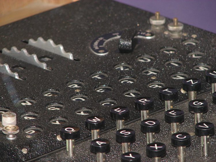 Input keys, output section, and cipher wheels of the Enigma machine. (Erik Pitti from San Diego, CA, USA, CC BY 2.0, via Wikimedia Commons)