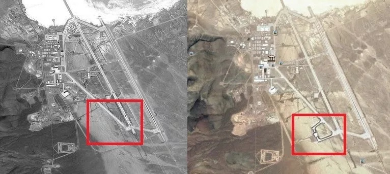 These side-by-side images of the “Area 51” facility show the recent addition of a large hangar and taxi strip. (Google Earth)