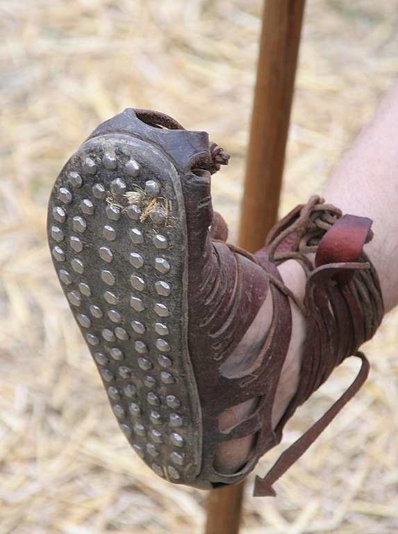 Pair of sandalwood soles (caligae), their shape has been preserved by the reinforcing nails. (Joanbanjo, CC BY-SA 3.0, via Wikimedia Commons)Caligae from below, showing hobnails (MatthiasKabel, CC BY-SA 3.0, via Wikimedia Commons)