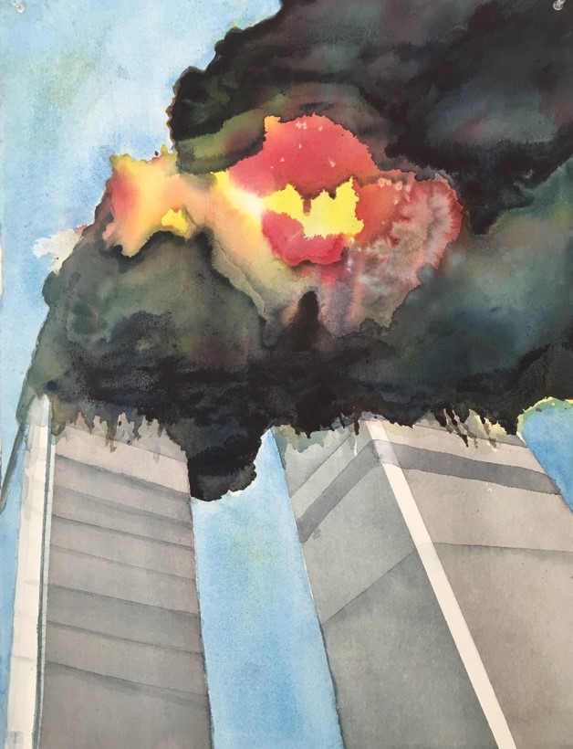Reflecting on the upheaval and after-effects of the Twin Towers attack, the traditional 16th Major Arcana Tarot card depicts a stone tower struck by lightning, with people falling from the building. Looking back, the unreal image of the burning World Trade Center Towers on September 11th is uncannily similar. In Tarot readings, the Tower asks, “What is revealed? How is my life radically changing? What is lost, what remains?” This version of the Tower emphasizes the powerful explosion and fire which triggered a renewed strength and resolve demanding freedom and independence.