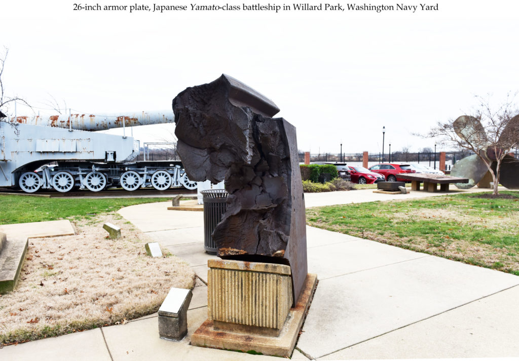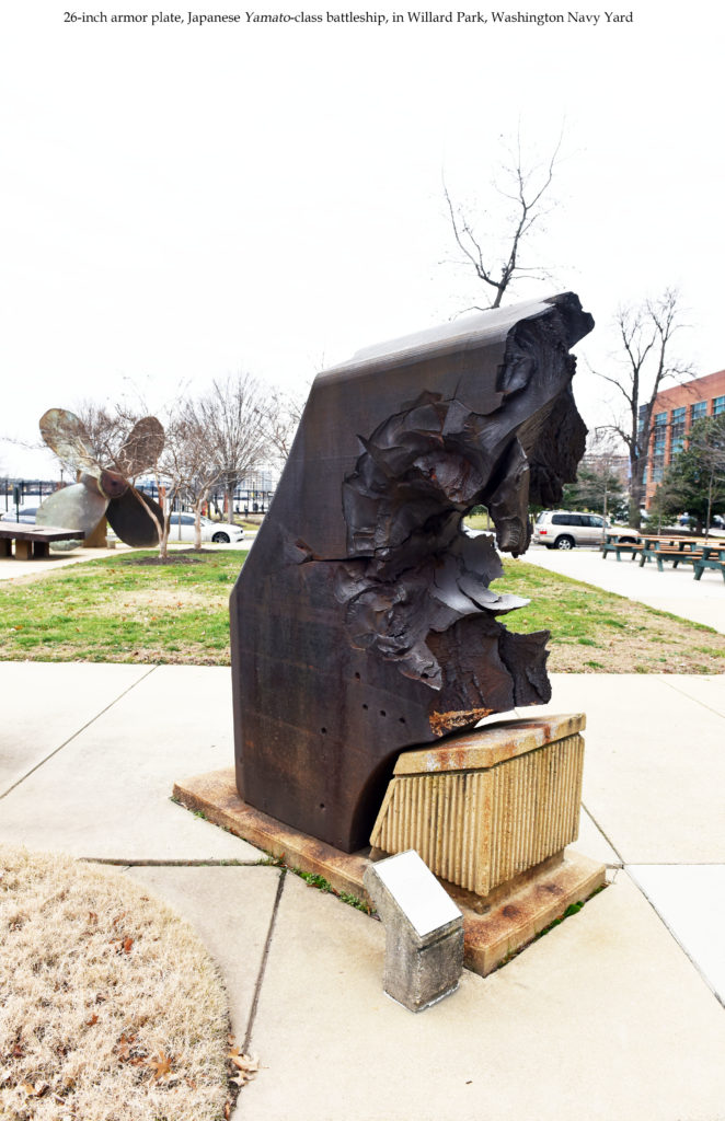 After the war, the Navy obtained a front turret facepiece (photos above) from the unfinished Shinano battleship and fired a 16″ gun projectile at it, specifically, the 2,700-lb 16″ Mark 8 Mod 6 AP with inert filler (“BL&P”). This was the last battleship projectile design by the U.S. in WWII. The round was fired at very high velocity from a new barrel and hit at 1,992 fps. The results can be seen above. The plate fractured into two pieces and the shell created a roughly cylindrical hole as it passed through the plate. There was no damage to the projectile, which retained enough velocity to head out over the Potomac River and was not recovered.