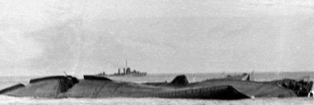 Still, Yorktown would not sink. The next morning, the captain asked for volunteers. The volunteers went back aboard the carrier, corrected her 26-degree list, were relighting her boilers, and were going to get her back to Pearl Harbor with a sea-going tug towing her when she was hit by two more torpedos fired by a Japanese submarine. Now, she was holed at her bottom, there was no saving her and she sank. The Yorktown was not an armored ship beyond splinter protection but her damage control crews did an incredible job. They did so well that it took six bombs and four torpedos to sink the unarmored aircraft carrier.