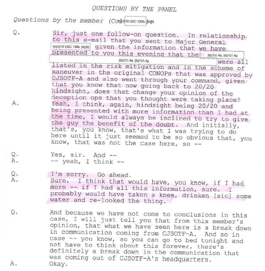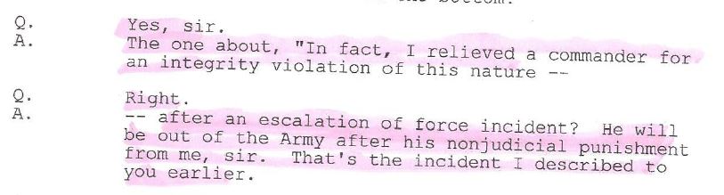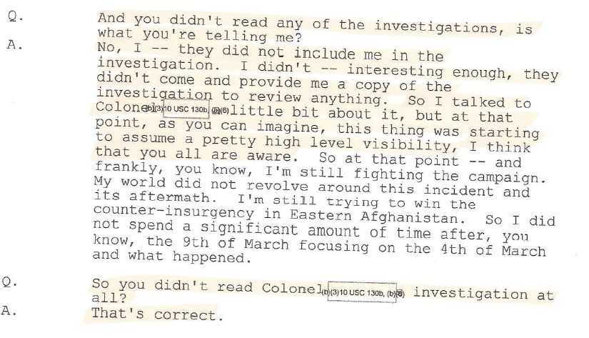 One of the thousands of recently declassified pages is General Nicholson’s (then a colonel) sworn testimony from the 2008 court of inquiry. It shows how, despite the facts, at the time of the 2008 COI, he still accused Fox Company of homicide even though his command, which was the first on the scene of the ambush in Bati Kot, never observed any bodies, blood, or evidence to support his accusation of a capital offense. He never actually read any of the investigation reports, even though he had the opportunity to do so prior to making his judgments.