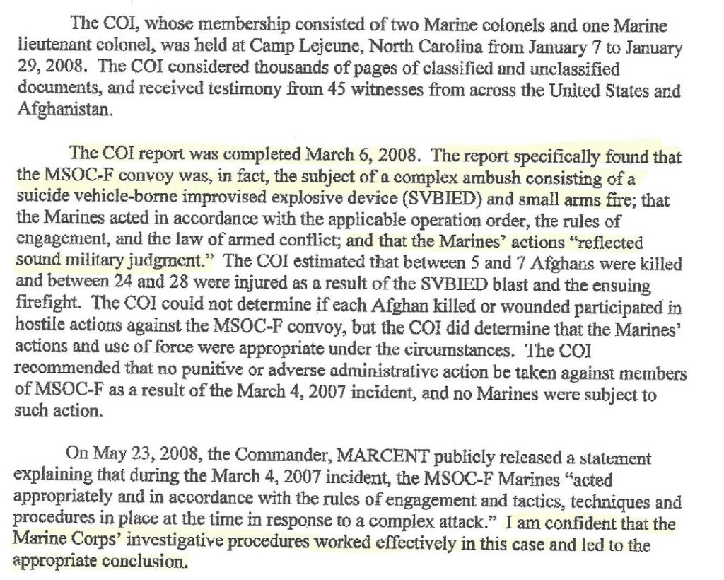 The answer provided above proves that he was willing to admit he missed important information, yet he still would not admit that he made a wrong decision in accusing Fox Company. Nicholson’s own investigating officer stated that the Fox Company patrol was “shot at from both sides of the road” in a reported dated 9 April, 2007 (one month prior to Nicholson’s 8 May, 2007, public condemnation of MSOC Fox).