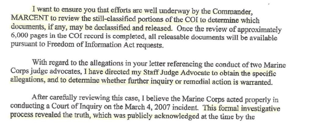 If the senior officer in the U.S. military responds to a standing U.S. senator that evidence should be provided, and “all releasable documents will be made available,” then that evidence should have been provided, because the commandant at the time (now chairman of the Joint Chiefs of Staff) ordered it. But it did not happen.